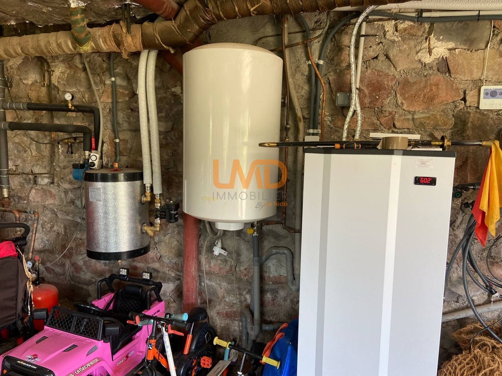 La maison est équipée d'un chauffage par pompe à chaleur air/air, assurant confort et économies d'énergie tout au long de l'année. La cuisine est dotée d'un équipement de base, offrant un espace fonctionnel pour préparer de délicieux repas en famille.