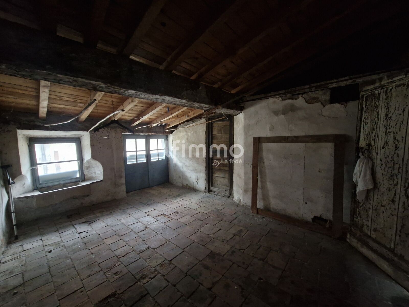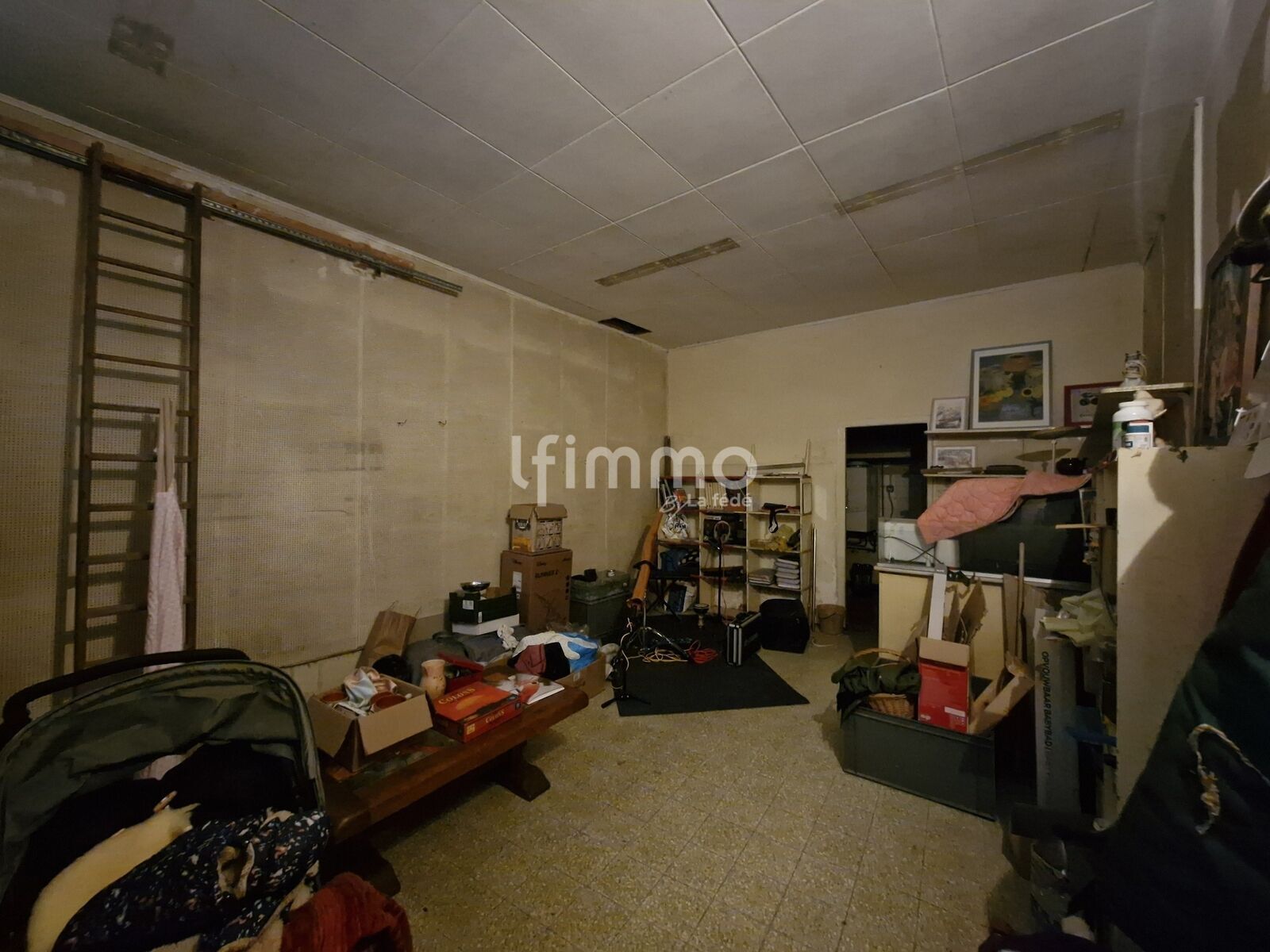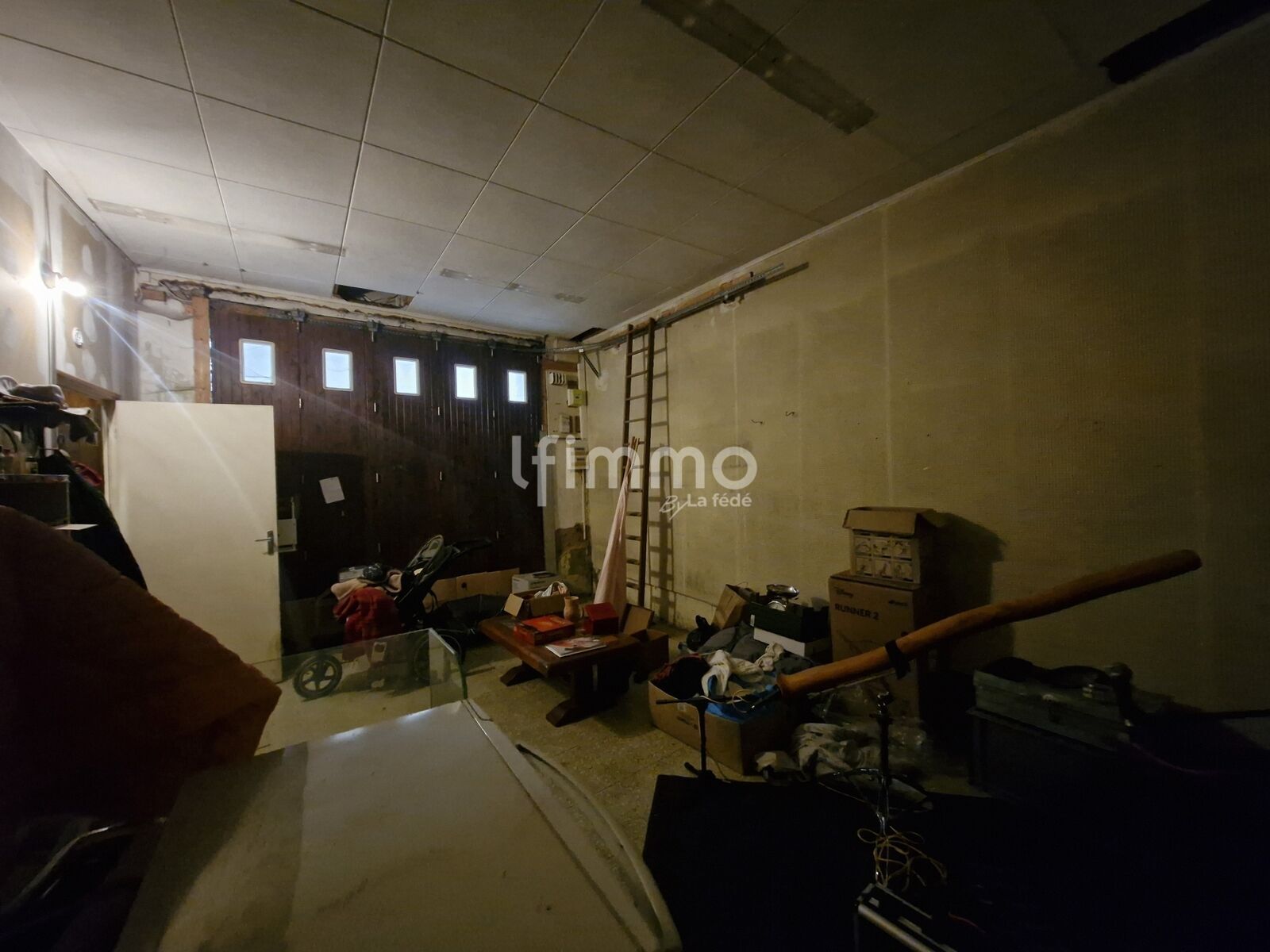 Garage d’environ 24 m², porte bois manuelle, sol carrelé