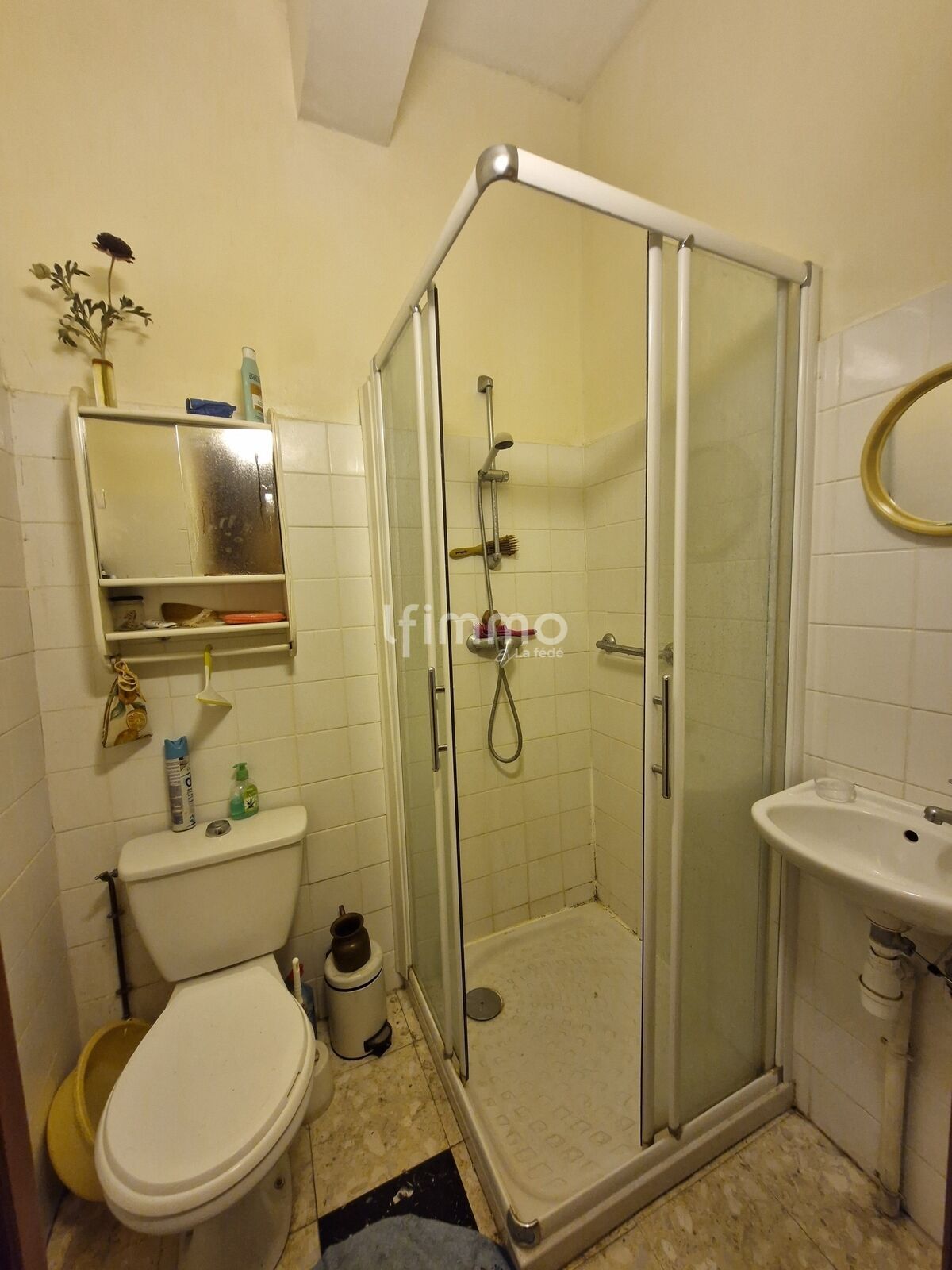 Salle d’eau d’environ 2 m² avec WC, douche, évier, carrelage