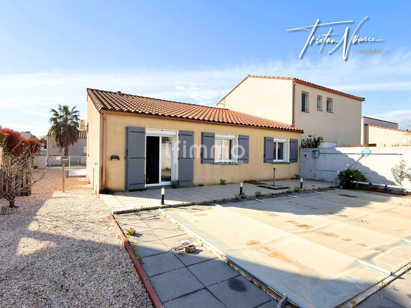 Exclusivement chez Tristan Nousse Immobilier, maison de plain-pied construite en 2006, en trois faces, avec piscine, garage et forage, située dans un secteur recherché de Elne.