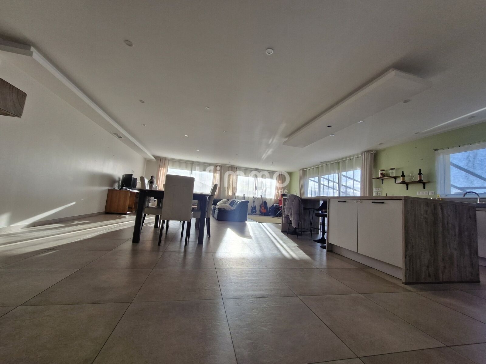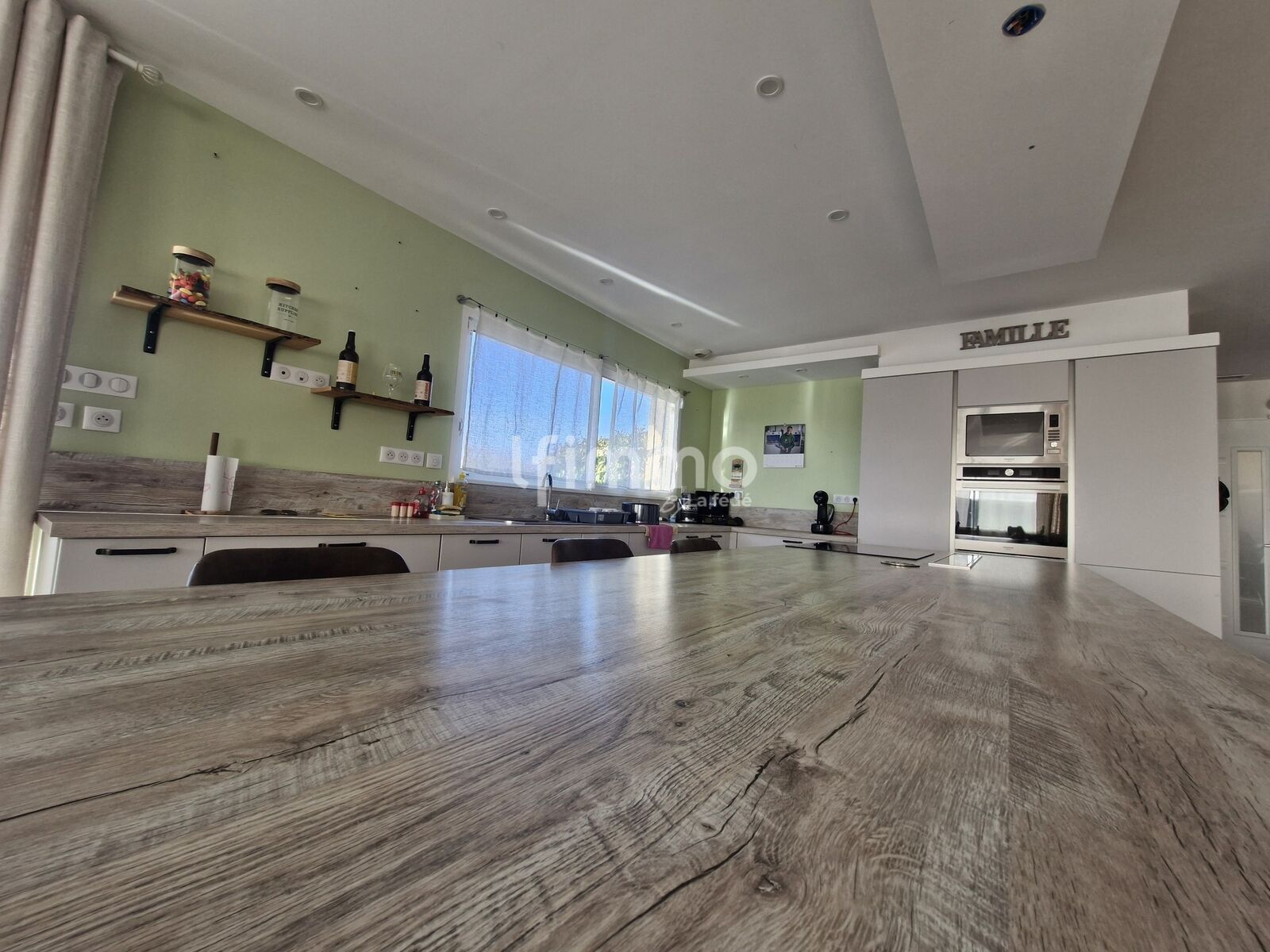 La maison s’ouvre ensuite sur une magnifique pièce de vie de 80 m², très lumineuse, comprenant un salon spacieux et une cuisine ouverte entièrement équipée (évier, four, plaque à induction, hotte, lave-vaisselle, réfrigérateur).