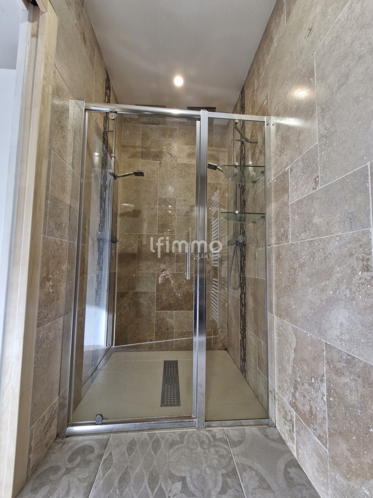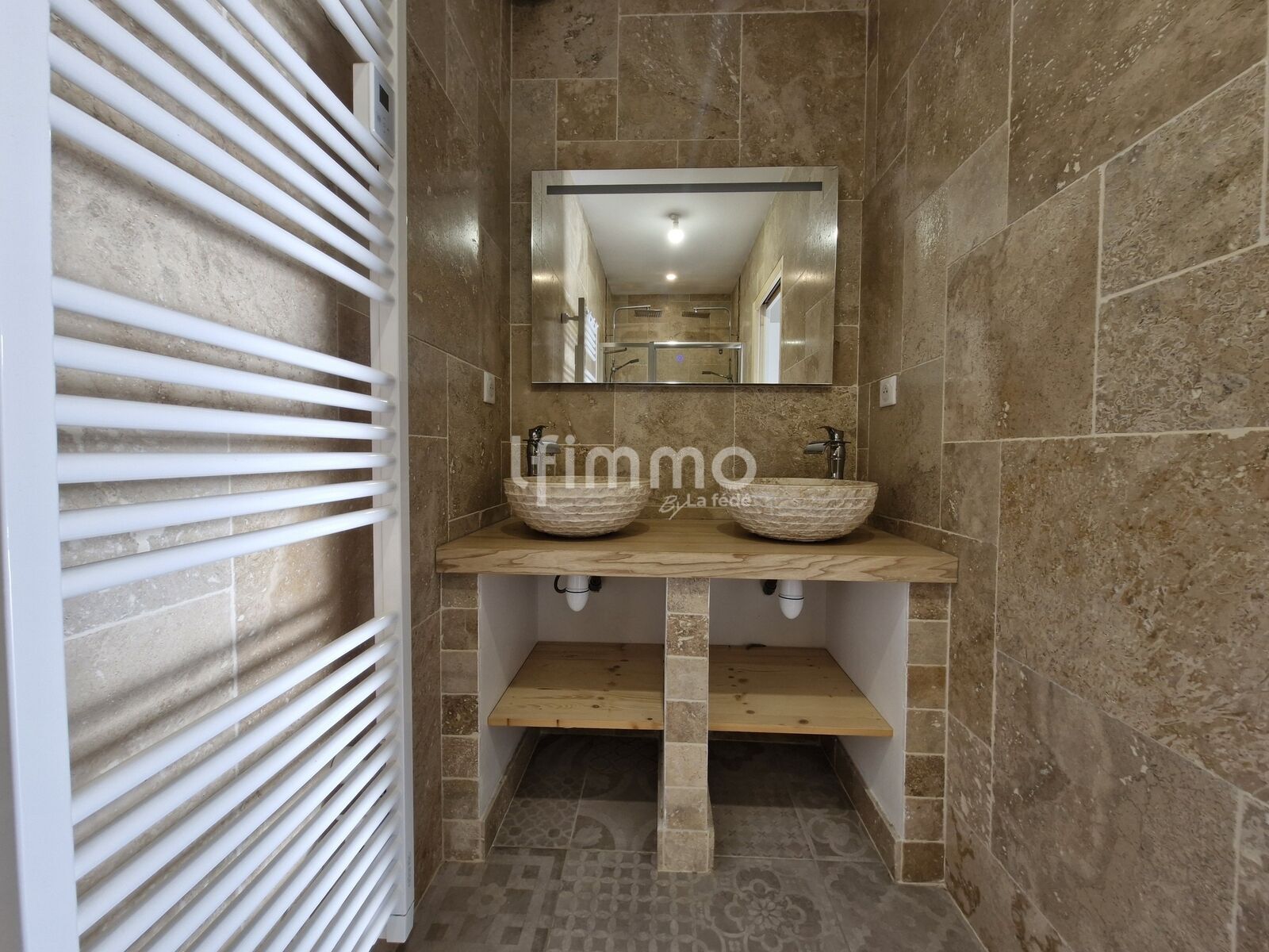 - salle d’eau de 4 m² (double vasque, douche avec double pommeau, sèche-serviettes, carrelage)