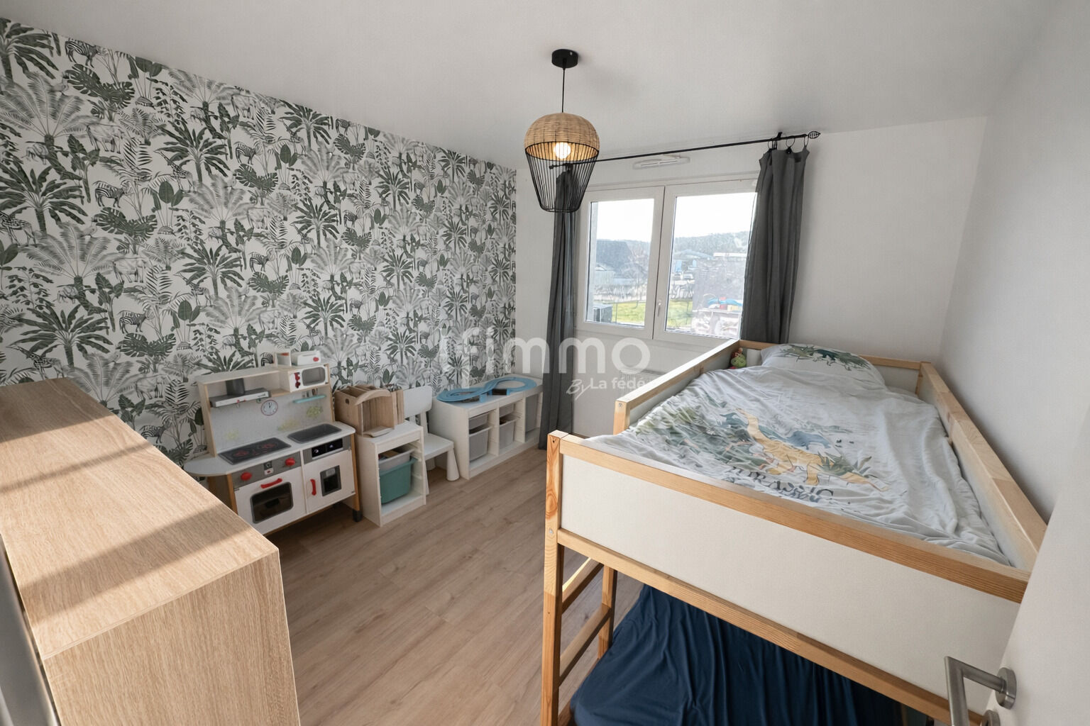 La cuisine s’ouvre sur le salon séjour, qui e file vers la terrasse sud sans vis à vis. C’est là que les matins prendront leur rythme, que les dîners d’été s’attarderont, que les enfants rentreront du jardin en réclamant à boire. Trois chambres pour que chacun ait son espace. Une vraie salle de bain, des WC séparés — les petits détails qui font la différence au quotidien.