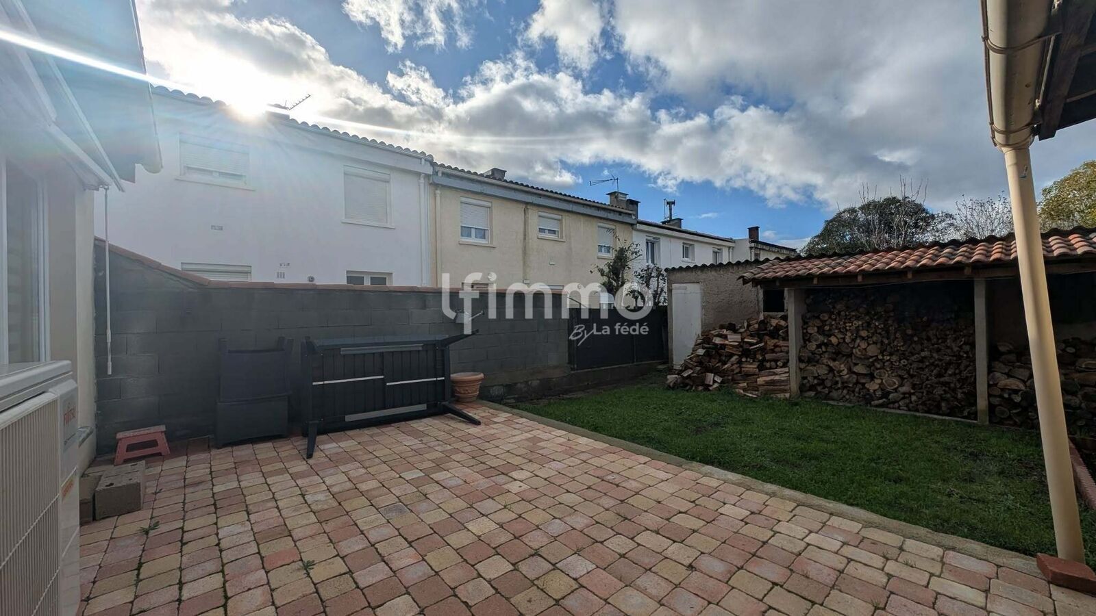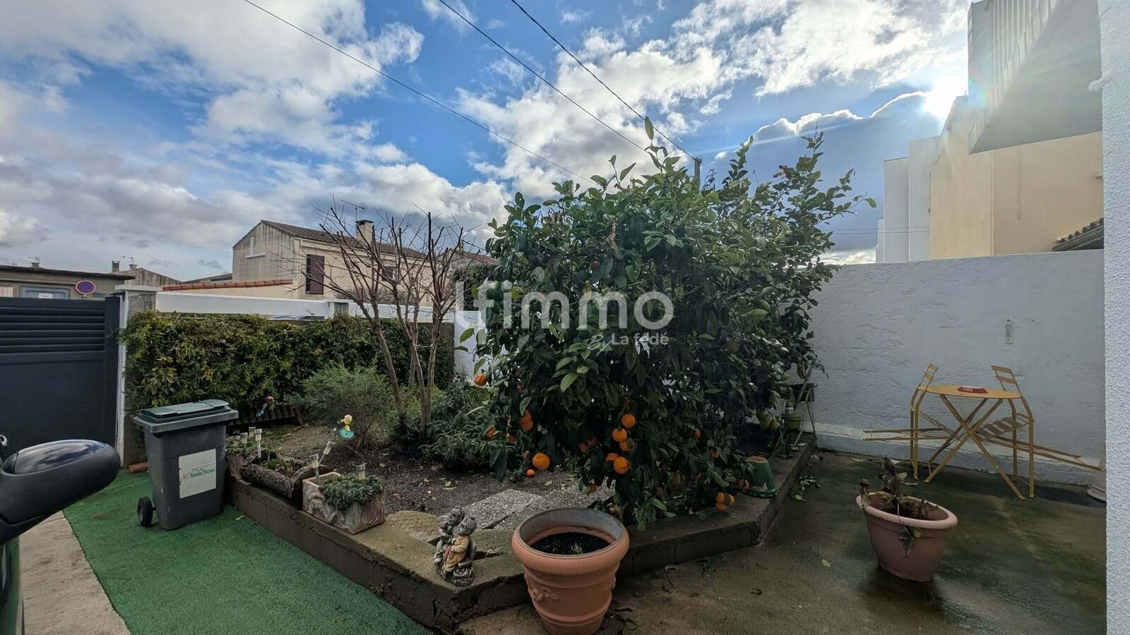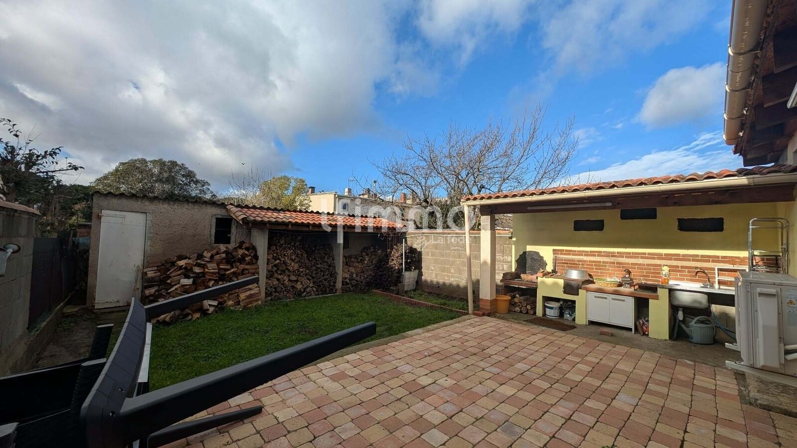 Jardin arrière entièrement clôturé, comprenant un espace cuisine d’été et des rangements