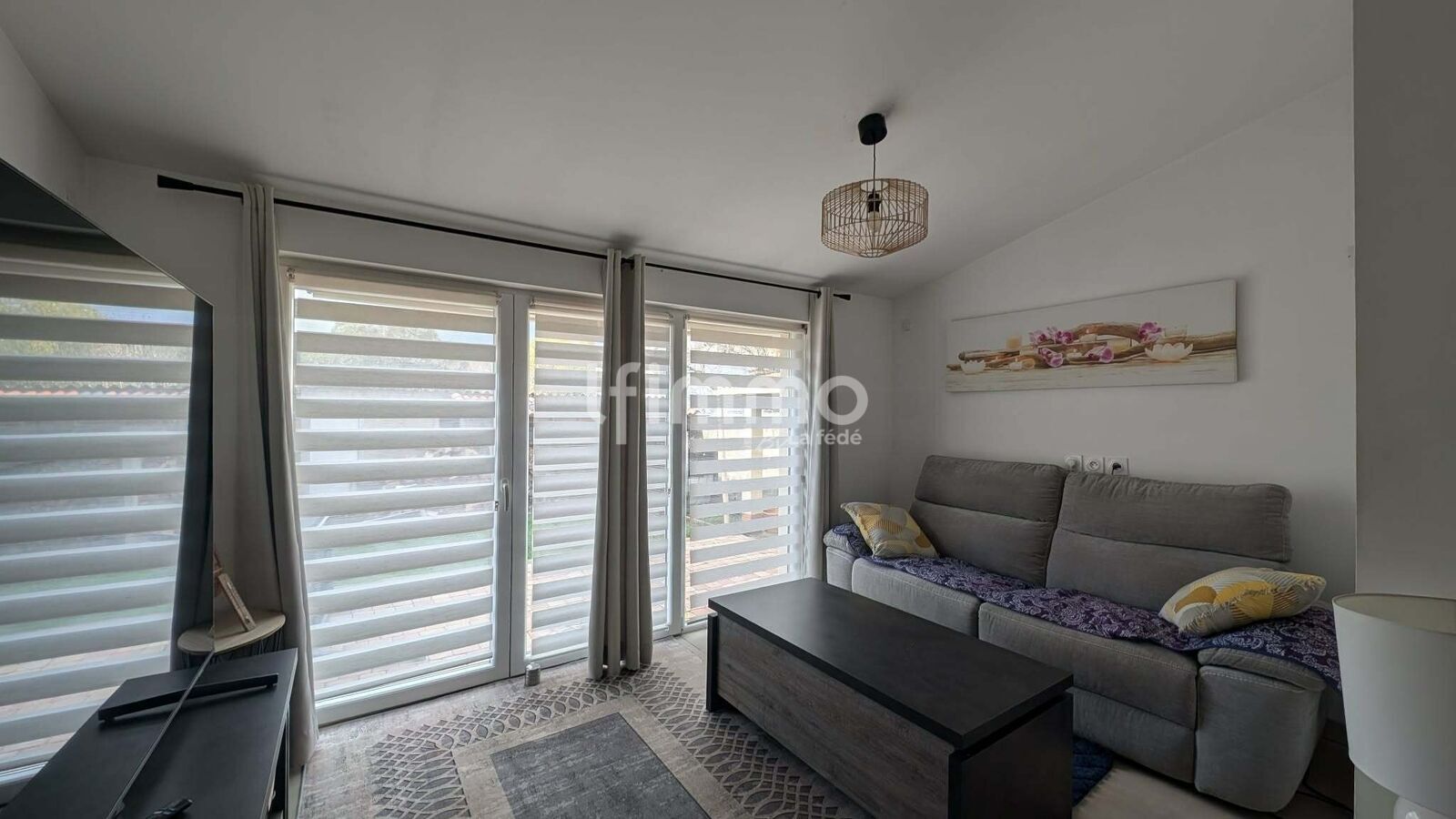 Coin salon avec baie vitrée ouvrant sur le jardin arrière