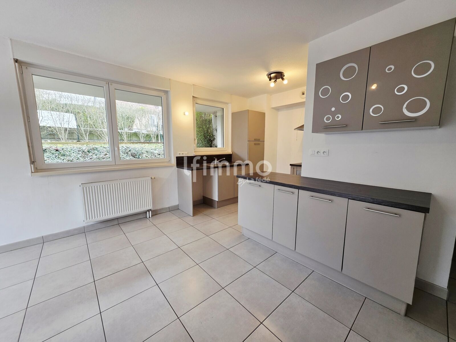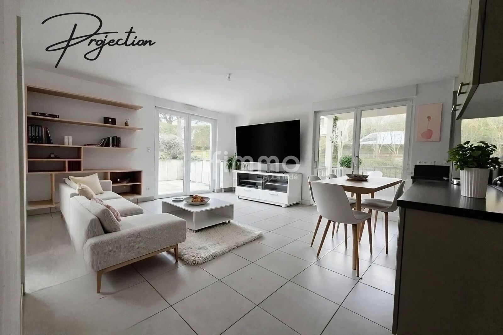 Une grande pièce de vie carrelée, ouverte sur une cuisine équipée