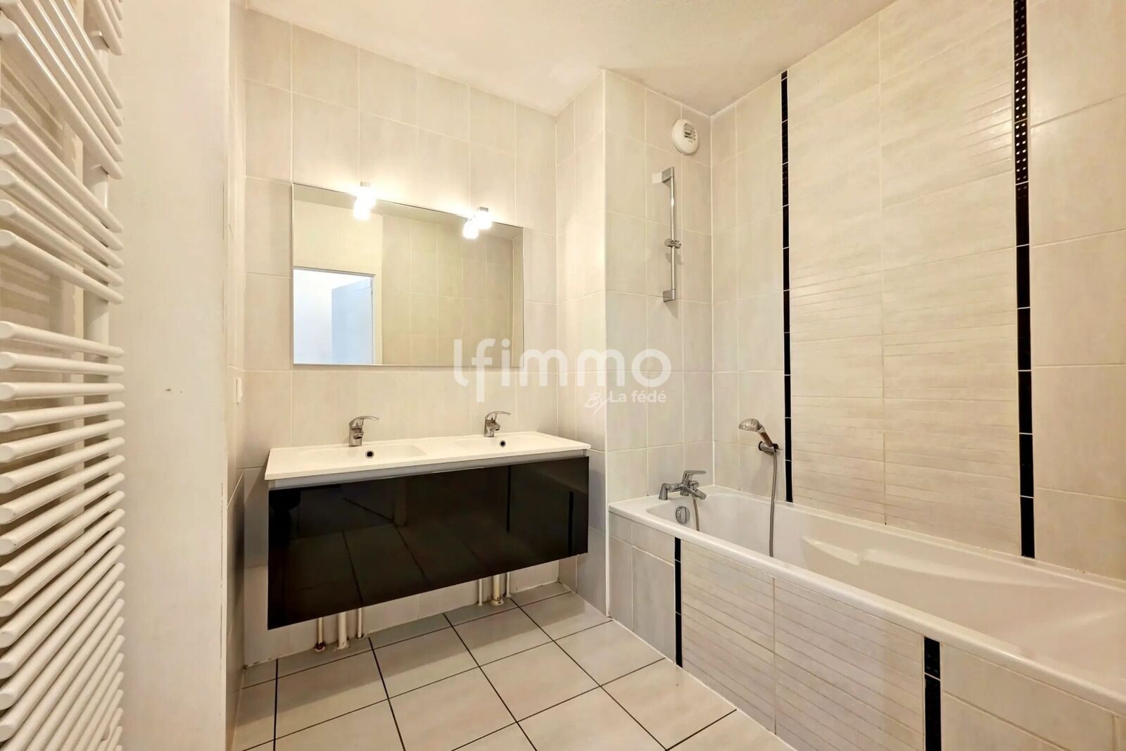 Une salle de bain moderne avec baignoire, double vasque et miroir