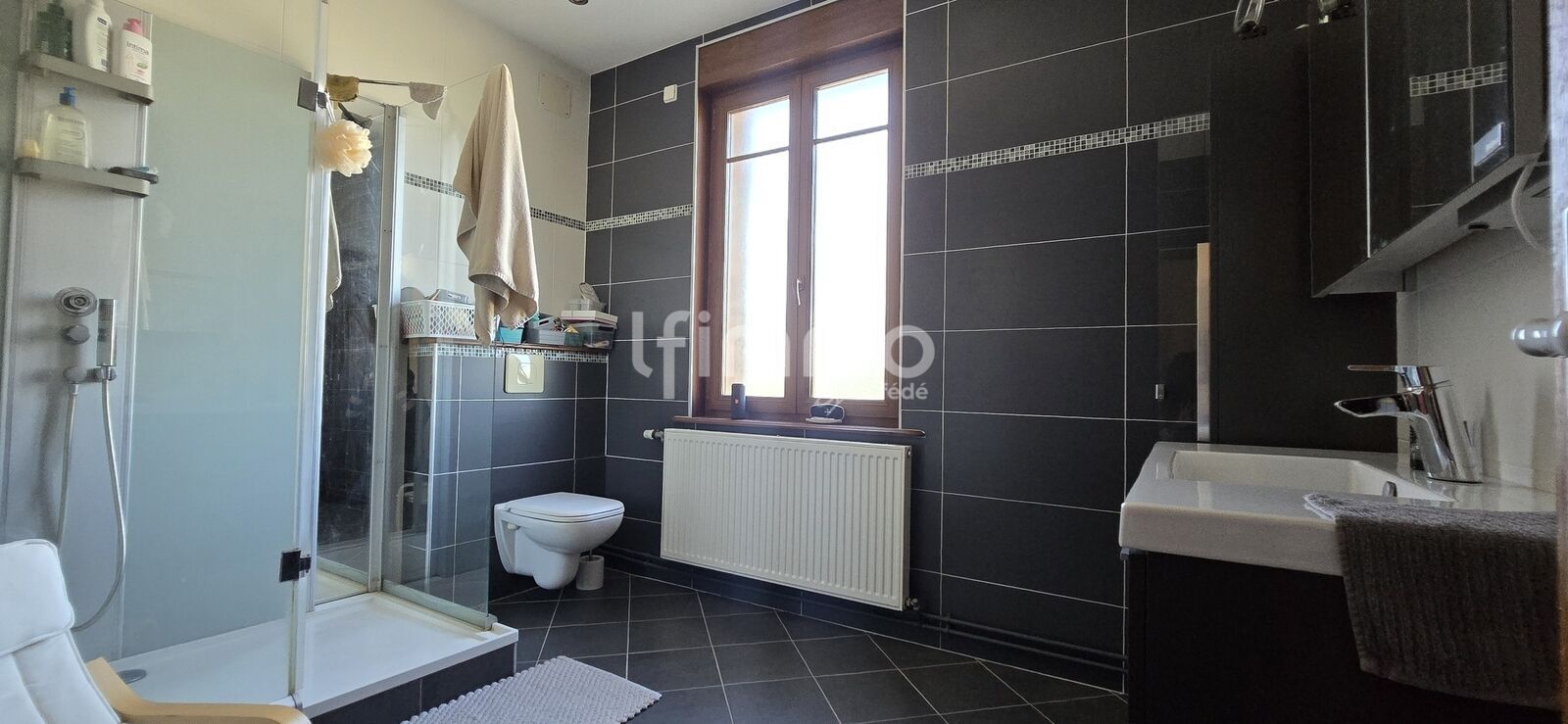 Un grande salle de douche, avec toilette