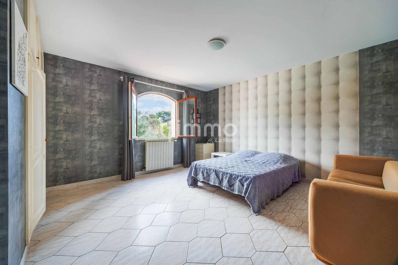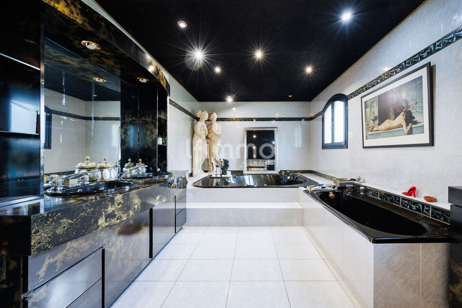 Egalement à l’étage une grande salle de bain unique dans le style art déco avec son jacuzzi, un dressing, un bureau et un WC.