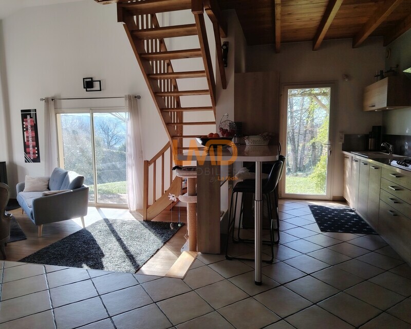 La maison est composée d'une superbe pièce de vie avec cuisine ouverte équipée, espace salon et salle à manger et mezzanine ouverte à l'étage