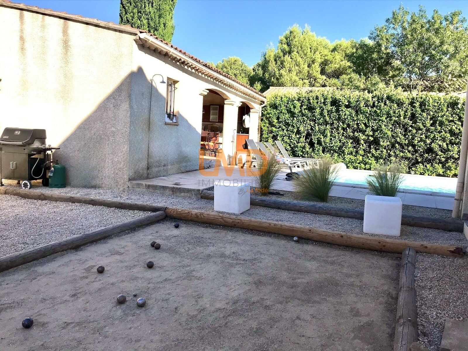 Un second espace accueille le barbecue et le four à pizza, idéal pour recevoir et partager des moments conviviaux, prolongés par un terrain de boules.