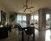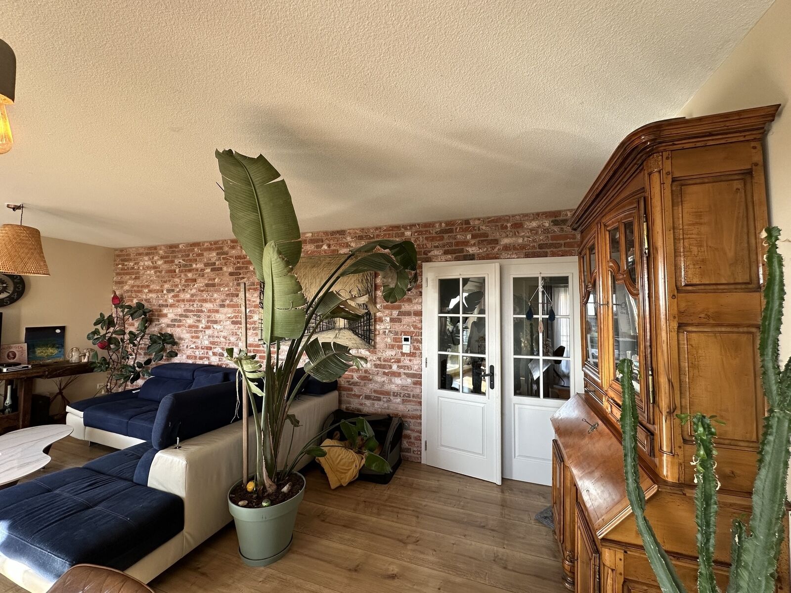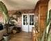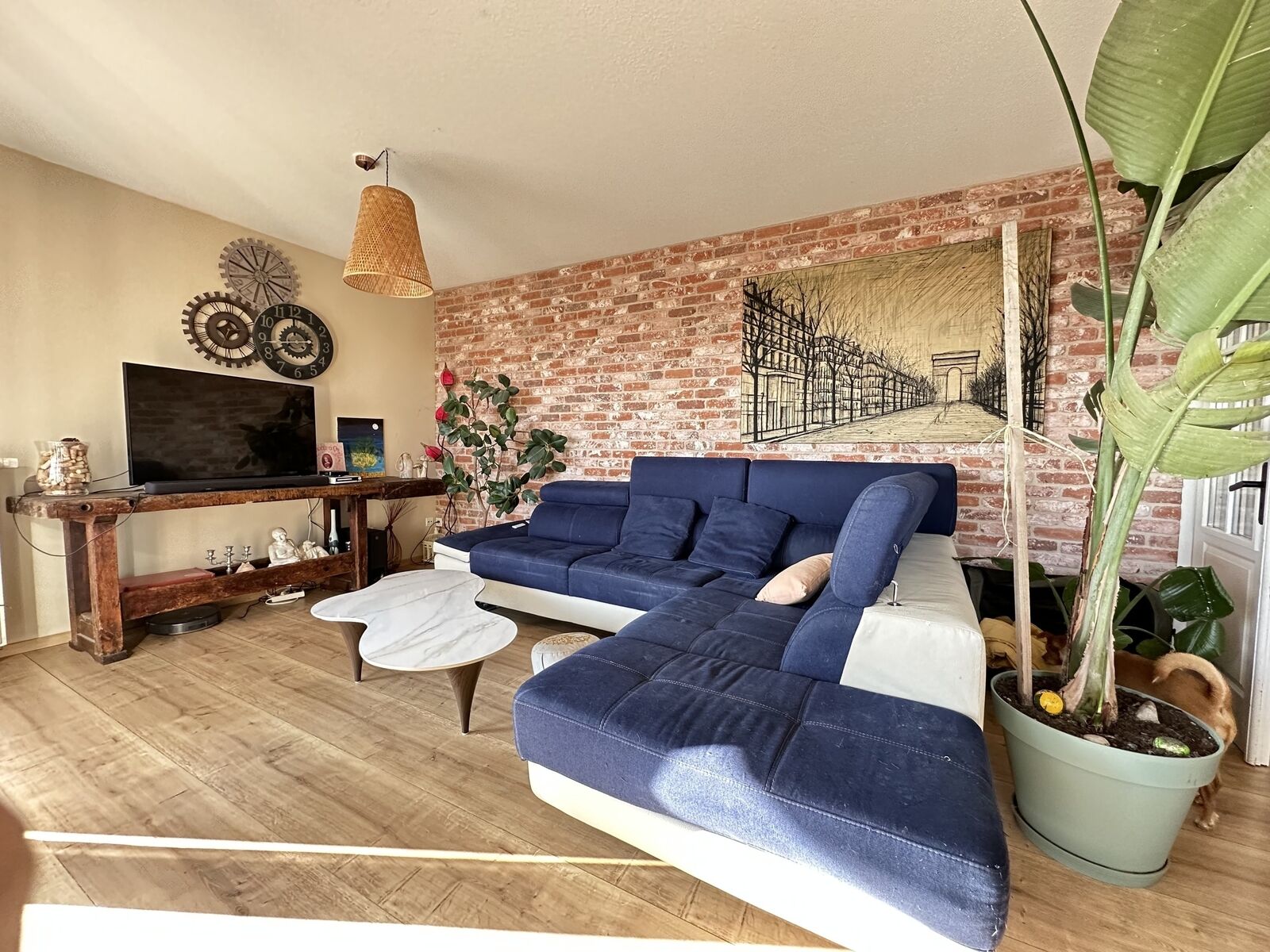 Un grand salon -séjour d'une superficie de 32 m² en L avec accès à la terrasse par de grandes baies vitrées ( véritables pierres au mur dans le salon).