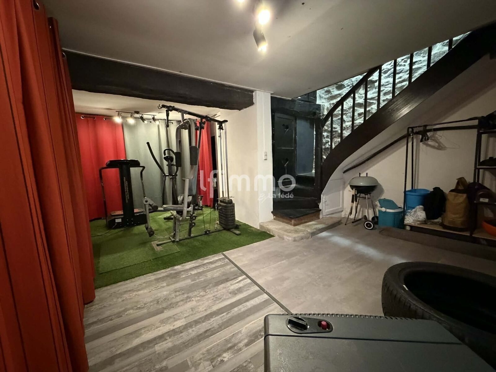 Le sous-sol aménagé offre un espace supplémentaire avec du matériel de sport inclus dans la vente et dispose d’un accès direct vers l’extérieur.