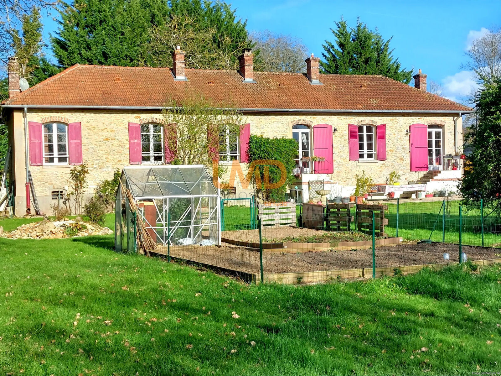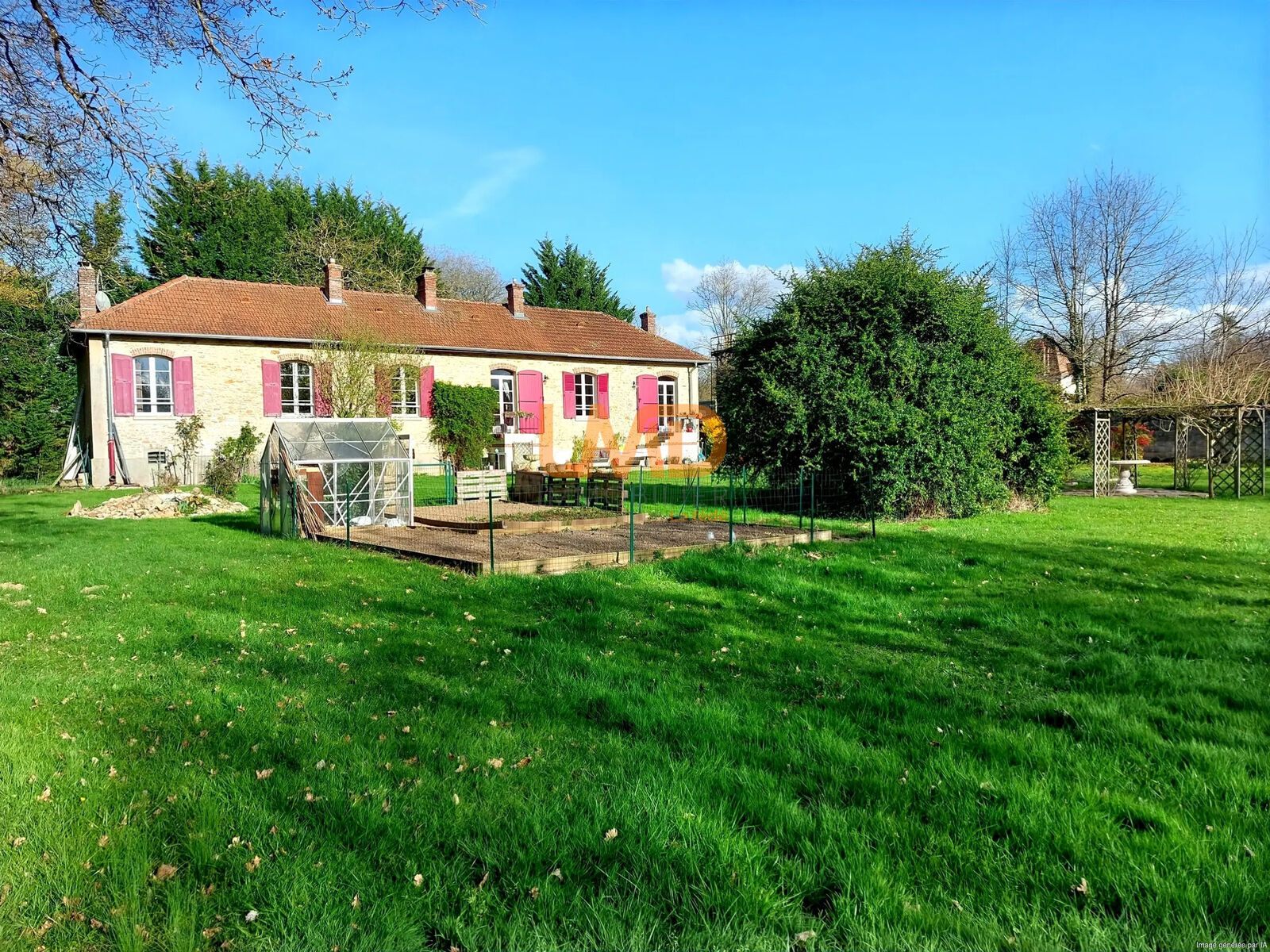 Son grand terrain divisé en jardin d'agrément joliment arboré et prairie.