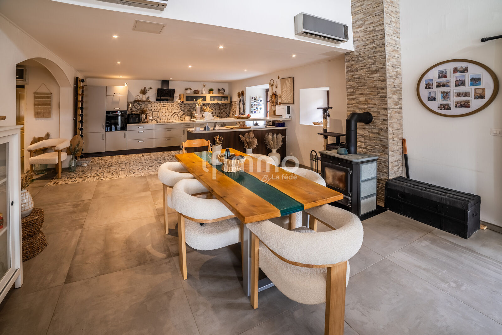 Le poêle à bois 🪵, véritable cœur de la maison, diffuse une chaleur douce et réconfortante, invitant à la détente.