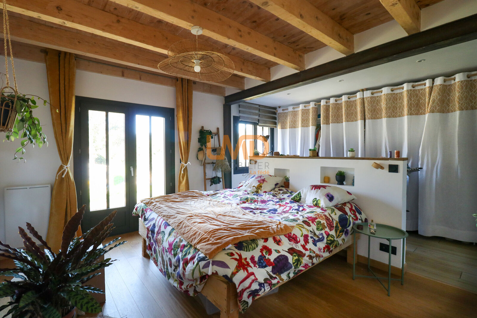 À l’extérieur, le terrain de 1600 m² invite à profiter pleinement des beaux jours : piscine, espaces de détente et nature environnante composent un cadre privilégié.