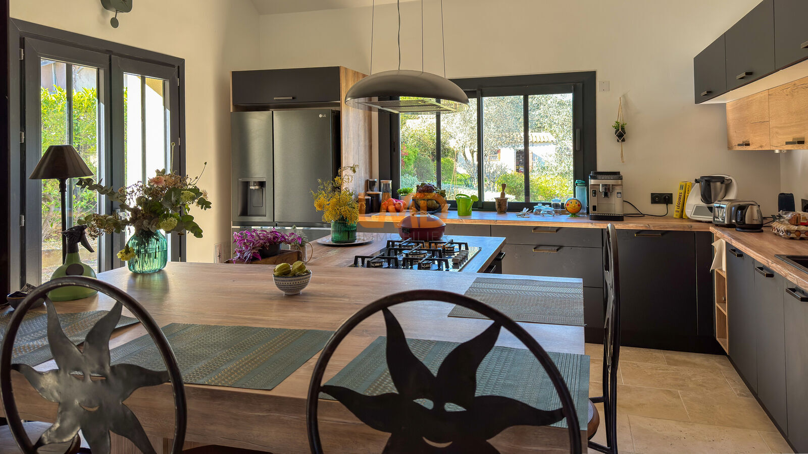 Au rez-de-chaussée, vous découvrez une pièce de vie spacieuse et baignée de lumière, avec séjour ouvert sur une cuisine entièrement équipée, créant un espace convivial et chaleureux.