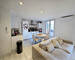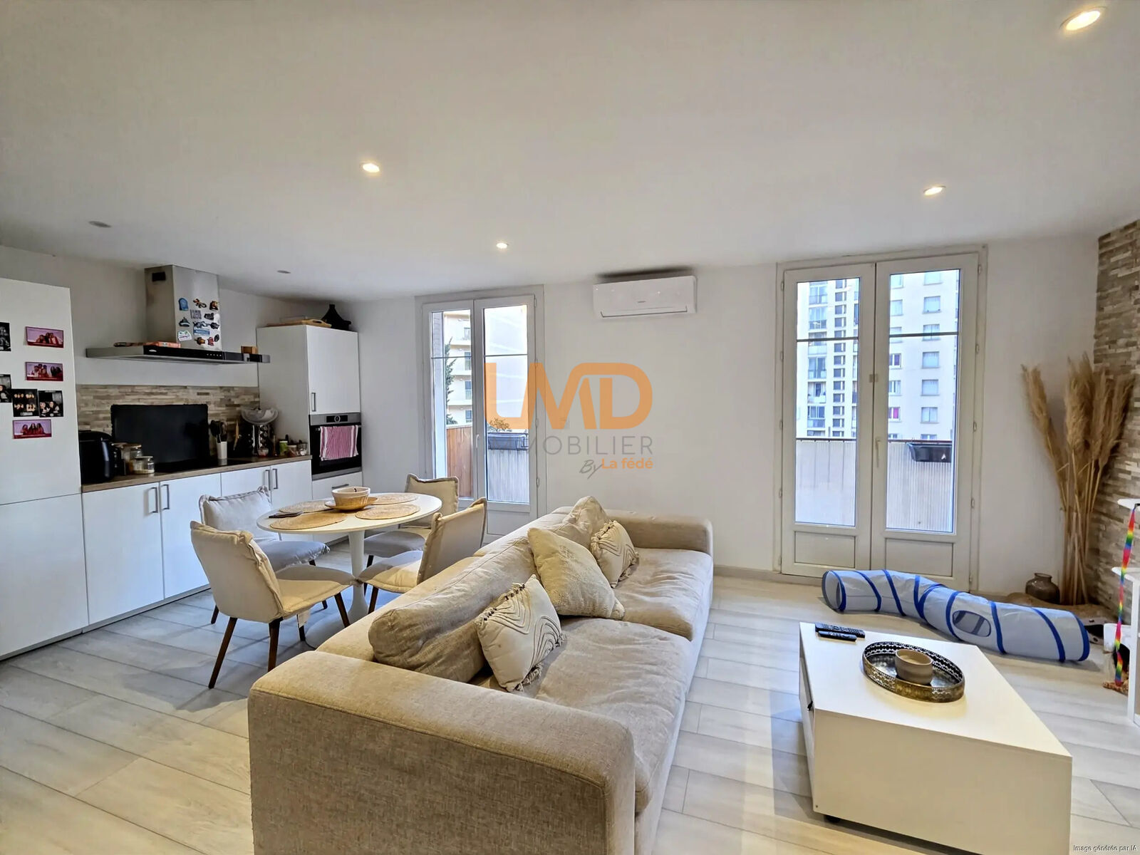 Agencement optimisé, un séjour lumineux avec cuisine ouverte contemporaine, deux chambres confortables, une salle d’eau moderne avec wc.