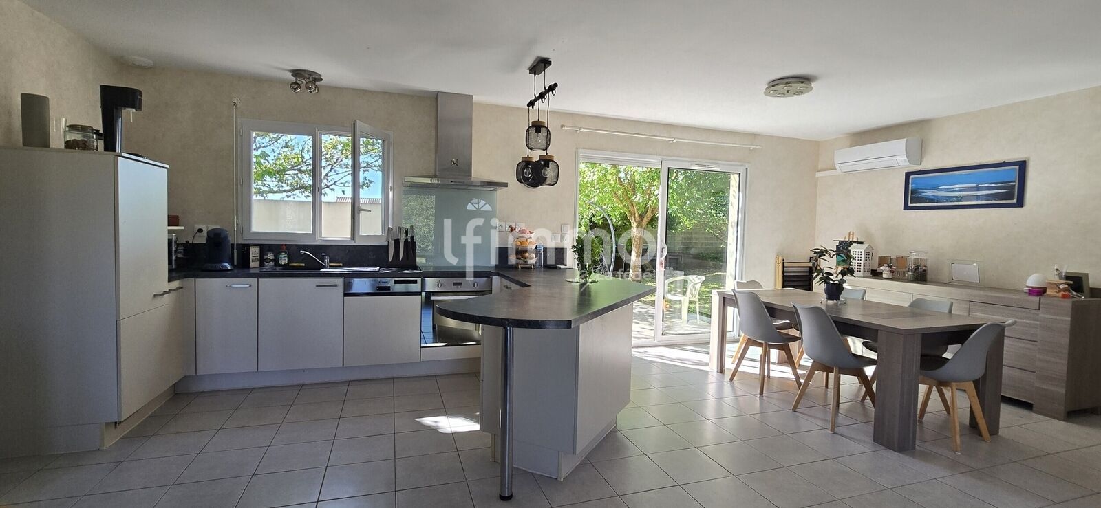 Dès l’entrée, vous découvrirez une pièce de vie spacieuse et lumineuse grâce à sa double exposition. L’espace se veut chaleureux et convivial avec sa cuisine ouverte, parfaitement aménagée, prolongée par un cellier-buanderie fonctionnel. Une climatisation réversible vous apportera également un confort optimal en toute saison.