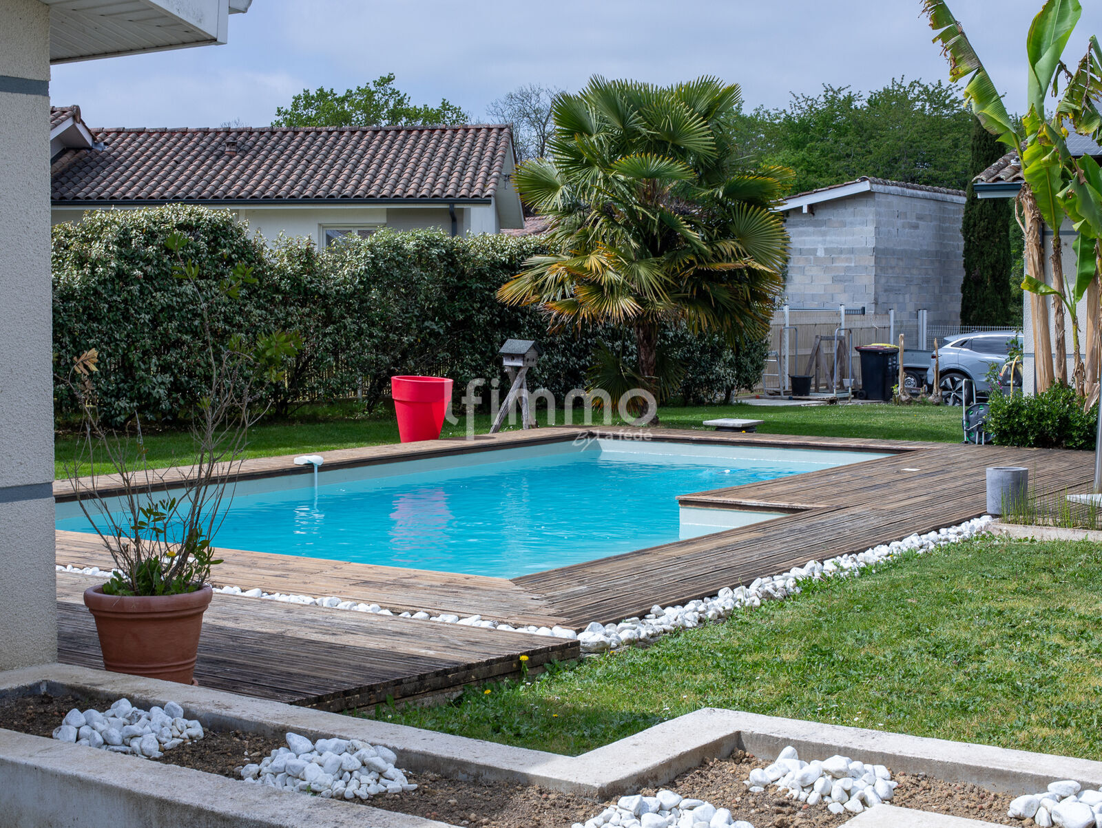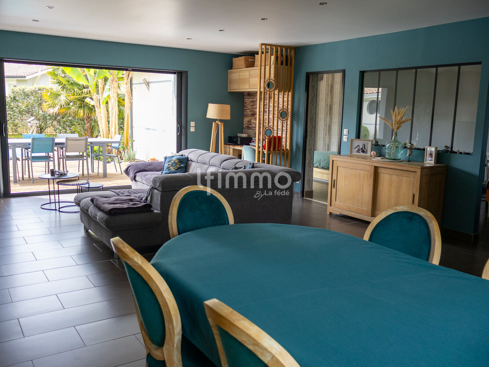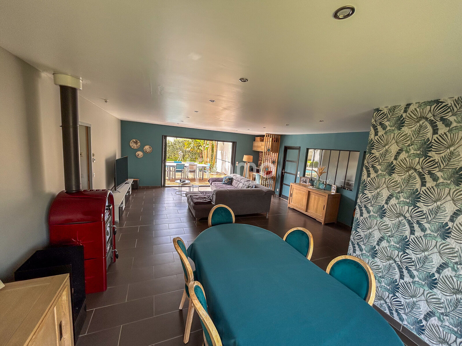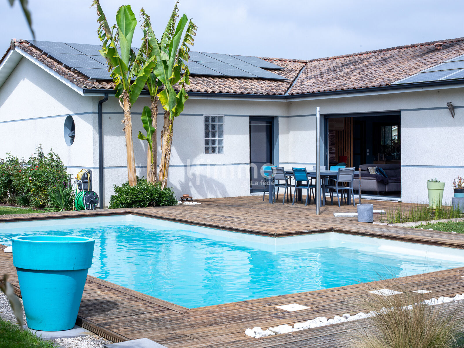 Dès l’entrée, laissez-vous séduire par la pièce de vie de près de 50 m², baignée de lumière grâce à sa double exposition. Sa baie vitrée à galandage ouvre pleinement sur une terrasse en bois et une piscine élégante, créant une parfaite continuité entre intérieur et extérieur.